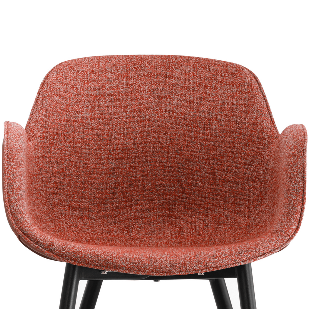 Feel the plush upholstery enhanced with light foam padding for added comfort. Its beautiful curved shape hugs your body as you sit, and the arm rests also gives extra support. This chair is a study in playful contrast - textile, faux leather and metal - working together to achieve a truly beautiful and remarkable piece.